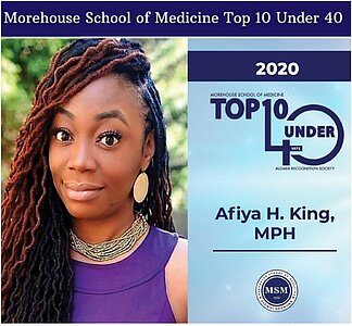 We are excited to share that Afiya King was chosed as one of the Top 10 Under 40 by her alma mater Morehouse School of Medicine. This award was designed to recognize Morehouse School of Medicine's stellar alumni who are establishing a track record of success in their profession and making a notable difference in their community with the promise of much achievement ahead. The Top 10 Under 40 embodies the Morehouse School of Medicine mission of creating and advancing health equity for all. Afiya is grateful for the opportunities provided by the Council to be able to impact the health, culture, and future of our communities.