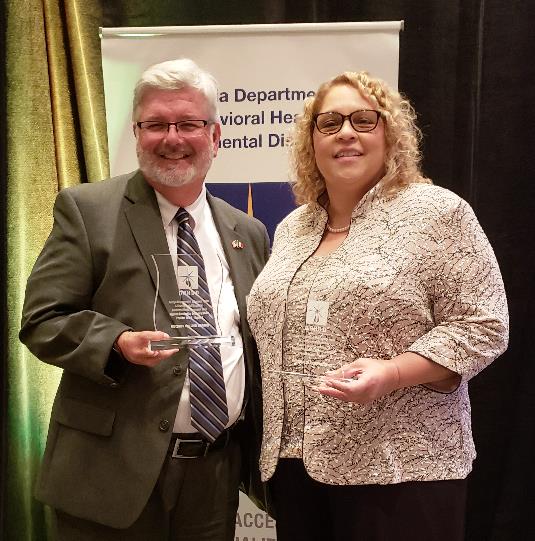 Harry Stevenson (left) and Ester Lopez won the Regional Provider of the Year Award in Region 5 and Region 1, respectively, at the Oct 3, 2018 Awards Dinner at the DBHDD Symposium at Lake Lanier.